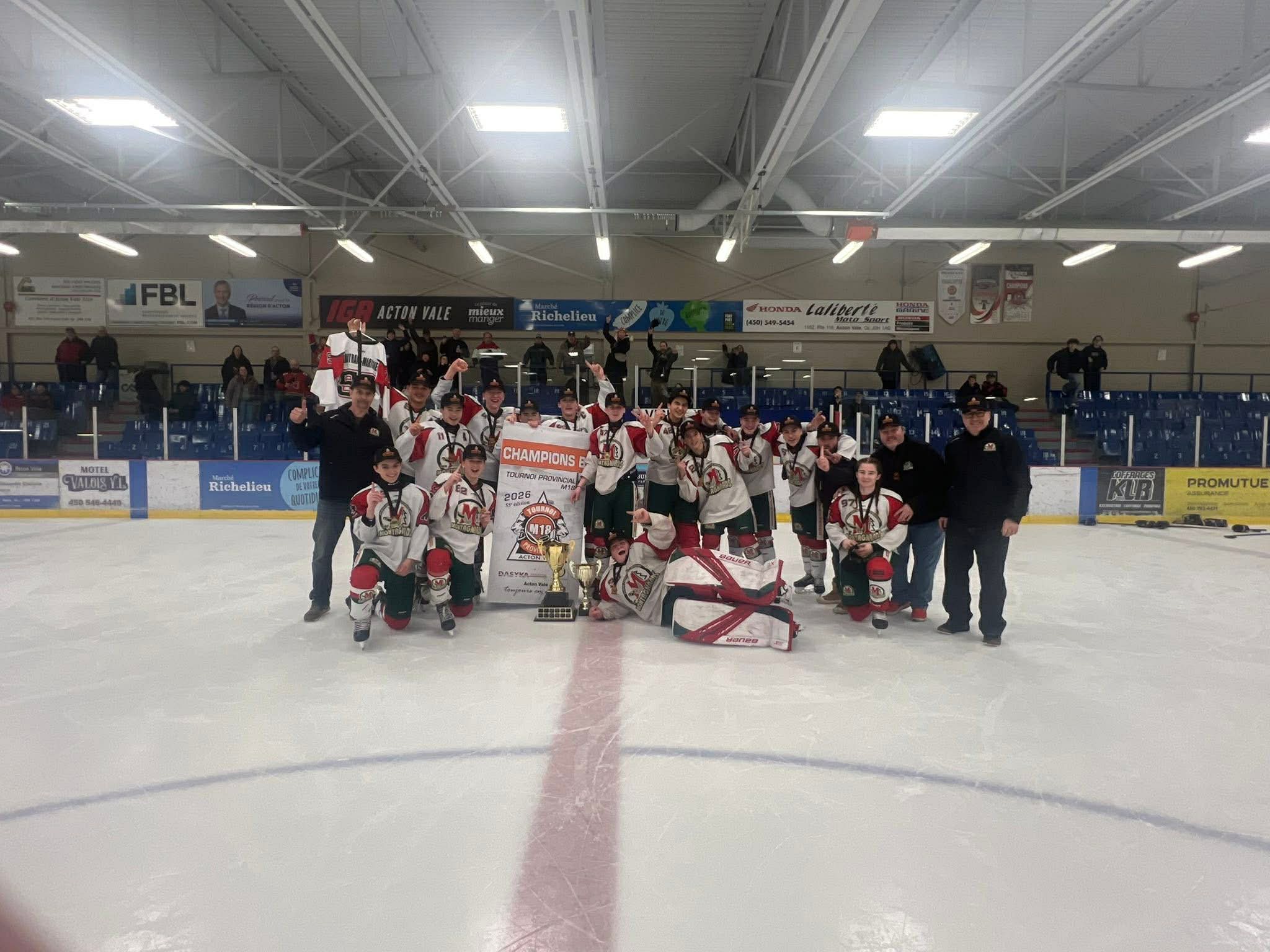 Grâce à vous tous et grâce à nos précieux partenaires, l’édition 2026 fût une réussite. Le comité de la 55e édition du Tournoi Provincial M18 d’Acton Vale est fier de remettre à l’Association de Hockey Mineur d’Acton Vale la somme de 10 000$ afin de leur permettre de réduire le coût d’inscription de nos jeunes hockeyeuses et hockeyeurs. Merci encore à tous de votre implication.